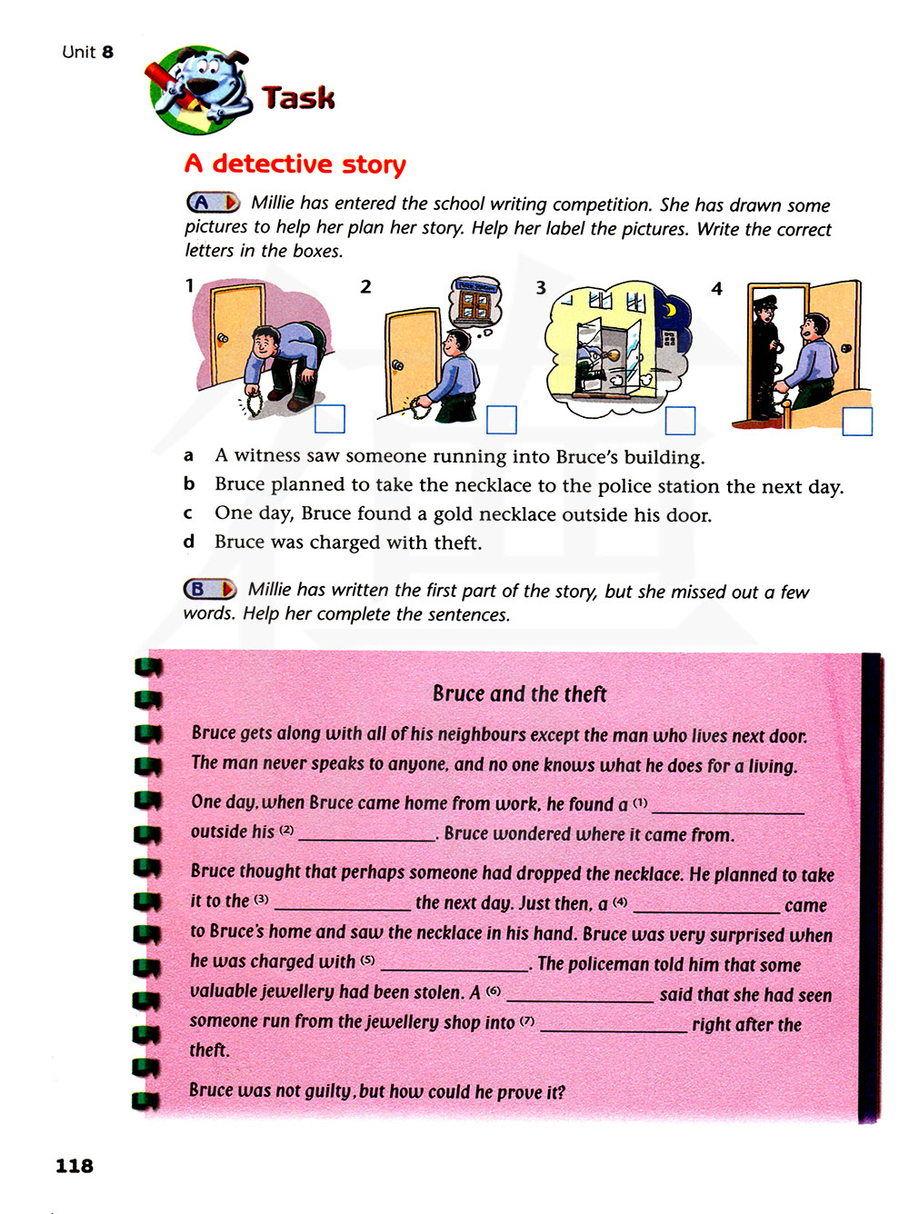 c、一天,布鲁斯在他家门外发现了一条金项链。 d、布鲁斯被指控偷盗。