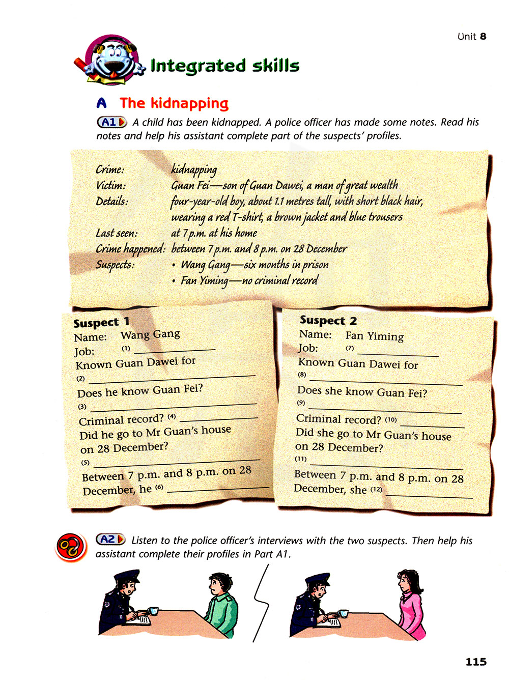 听一听警官对这两个嫌疑人的询问。然后帮助他的助手完成A1部分他们的档案。