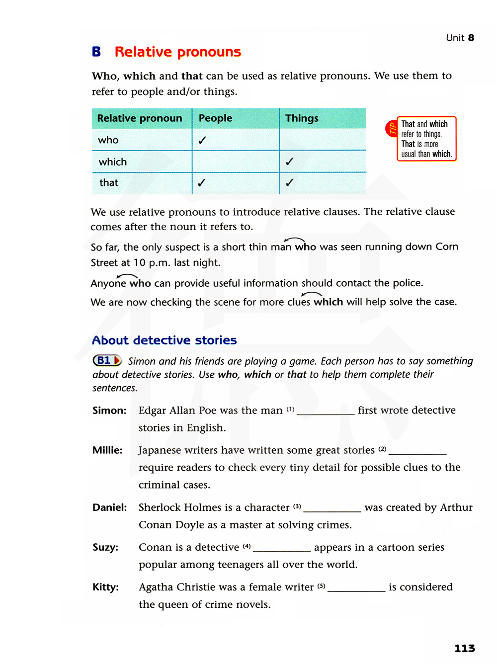 西蒙和他的朋友们在玩一个游戏。每个人必须说一些有关侦探故事的内容。使用who,which或that帮助他们完成他们的句子。