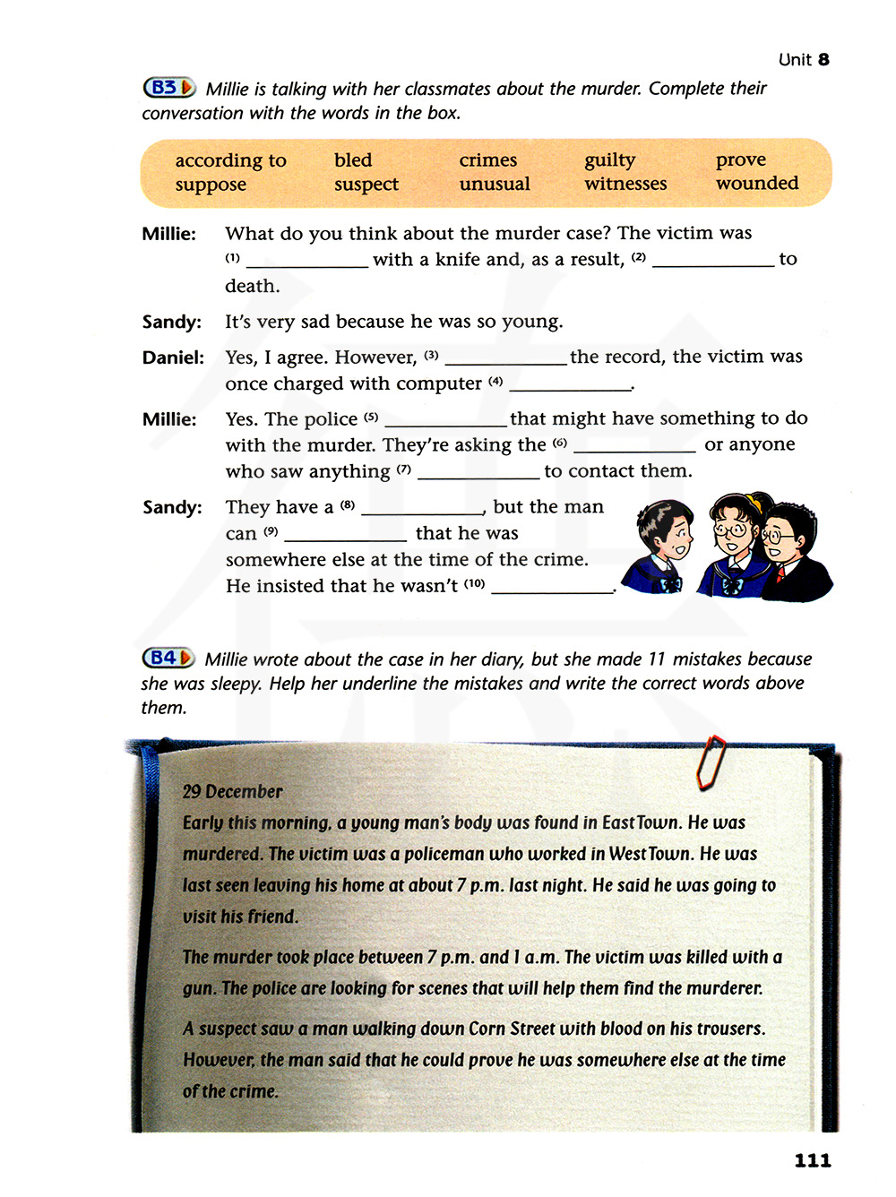 米莉正在和她的同学们谈论那起谋杀案。用方框里的单词完成他们的对话。