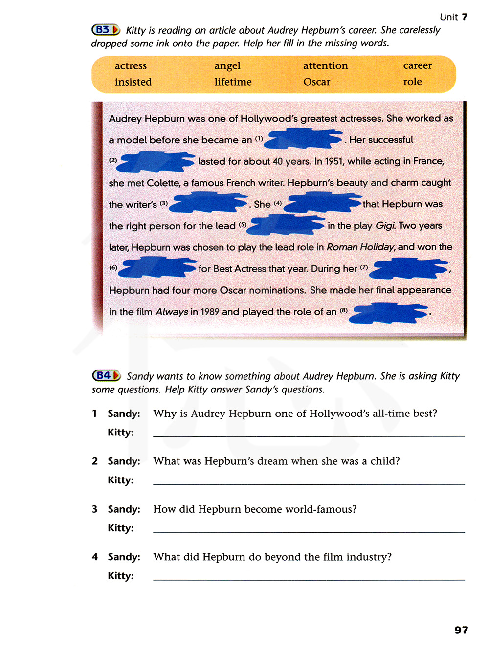 基蒂正在阅读一篇关于奥黛丽.赫本职业生涯的文章。她不小心将一些墨水掉在了纸上。帮助她填上缺失的单词。