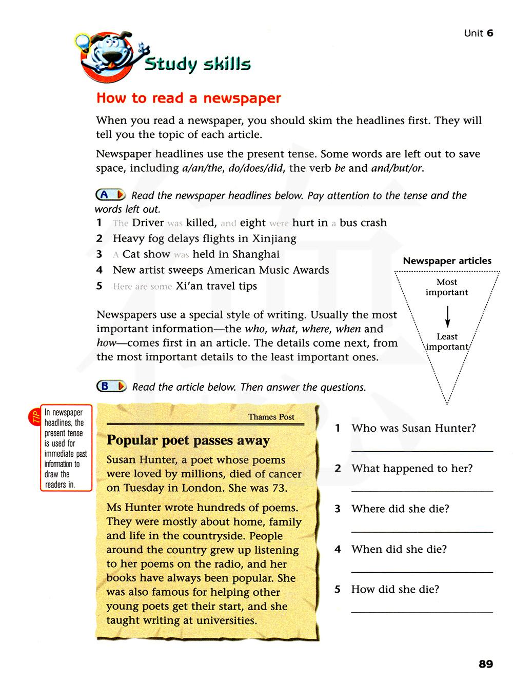 报纸使用的是一种特殊的写作文体。通常最重要的信息---谁,什么事件,哪里发生的,何时发生的以及如何发生的一一出现在一篇文章的最前面。接下来是细节,从最重要的细节到次要细节。