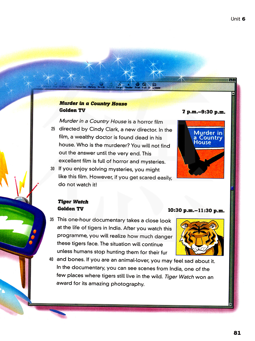 这部长达一小时的纪录片近距离观察了印度虎的生活。在你看完这个节目后,你会意识到这些老虎面临的局势有多危险。这种情形还将持续下去除非人们不再为它们的毛皮和骨头而捕杀它们。如果你是一名动物爱好者,你可能对此会觉得难过。在这部纪录片中你能看到来自印度的景象,那里是仅存的几处还有野生虎生存的地方之一。《观看老虎》获得了最佳摄影奖。