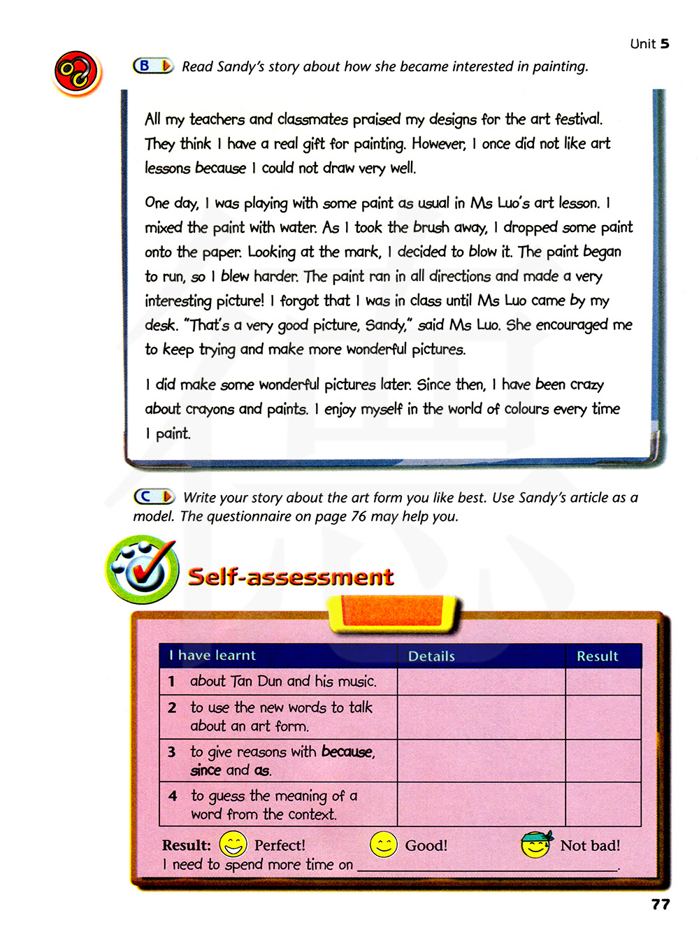写一写有关你最喜欢的艺术形式的故事。使用桑迪的文章作为范例。第76页的问卷也许对你有帮助。