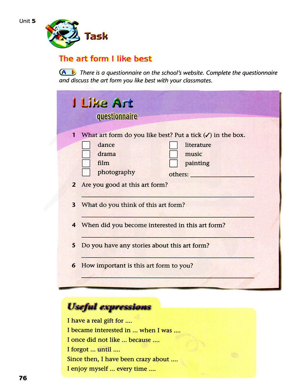 学校网站上有一份调查问卷。完成问卷并和你的同学们讨论你最喜爱的艺术形式。