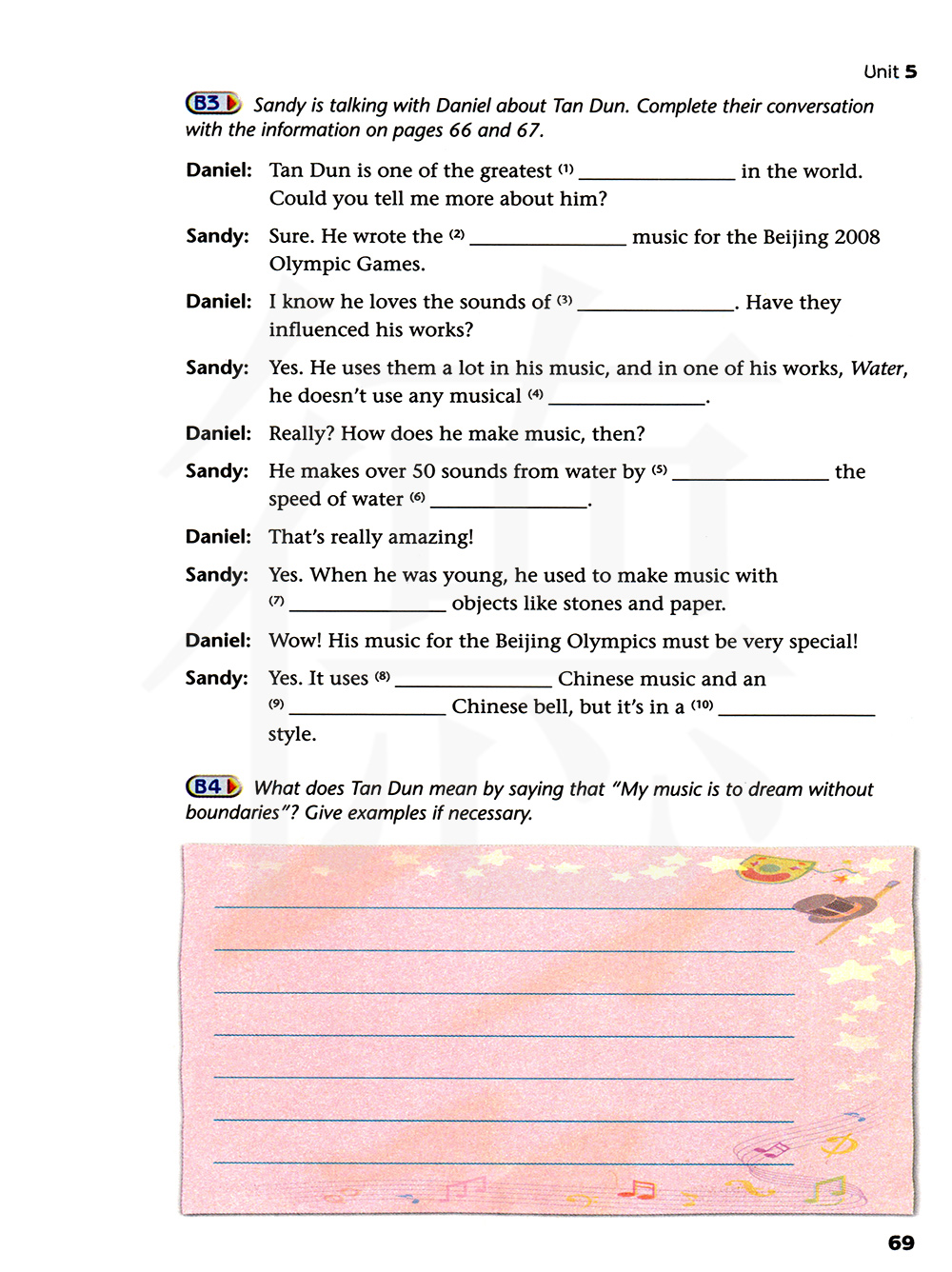 桑迪在和丹尼尔谈论有关谭盾的事。用66页和67页的信息完成他们的对话。