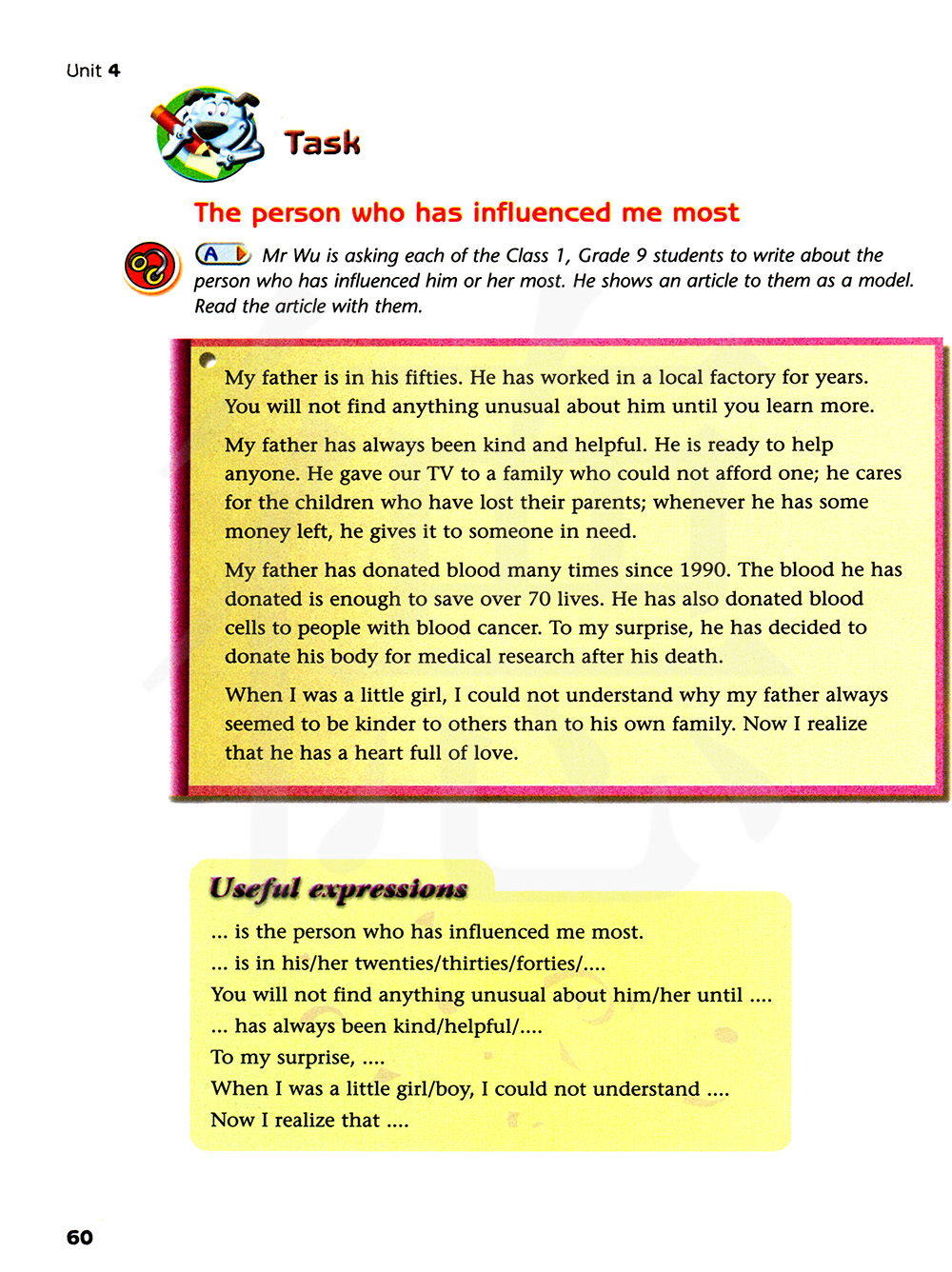 吴老师叫九年级一班的每一位同学都写一写对他们影响最深的那个人。他给他们展示了一篇文章以作为范例。和他们一起阅读这篇文章。