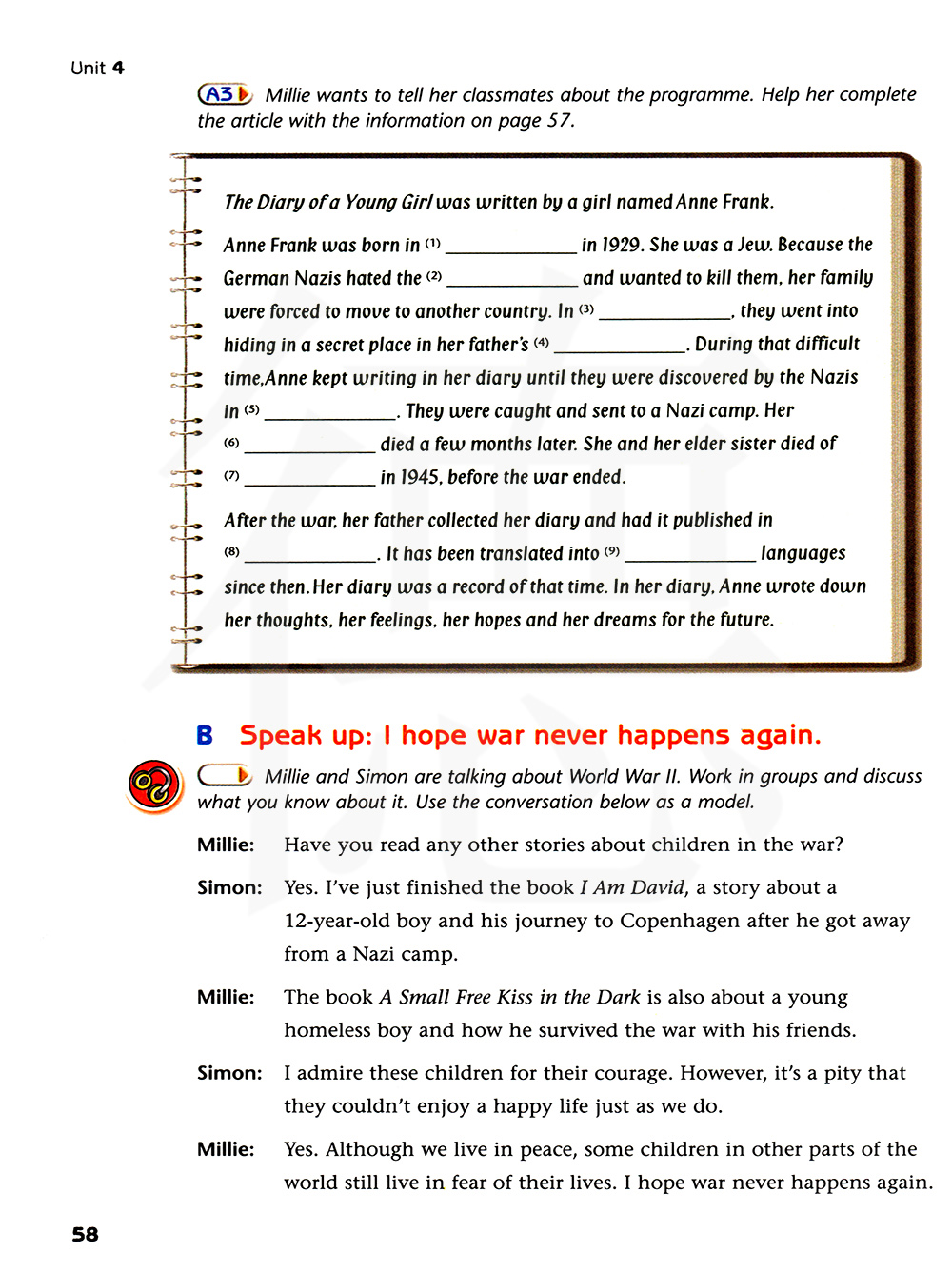 米莉:你读过其他关于战争中的孩子们的故事吗? 西蒙:是的,我刚刚读完《我是大卫》这本书,这是关于一个十二岁的小男孩逃离纳粹营后去哥本哈根的旅程。
