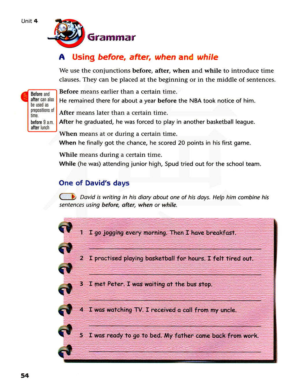 大卫正在写有关他的一天的日记,帮助他用before,after,when和while连接他的句子。