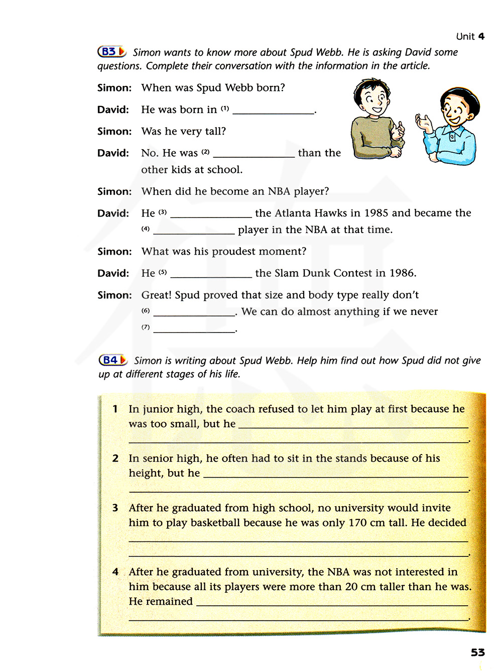 西蒙想知道更多关于斯巴德的信息,他正在问大卫一些问题,用文章中的信息完成他们的对话。