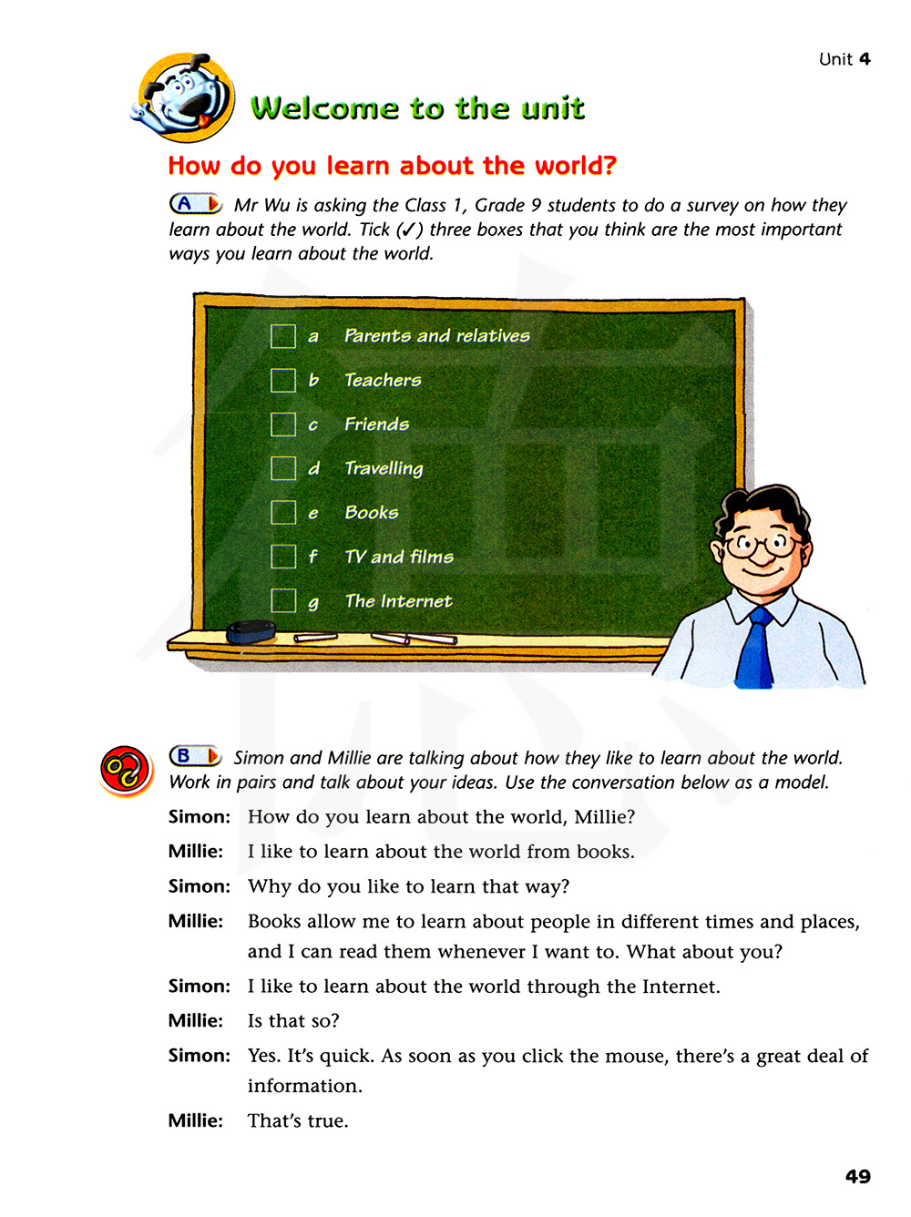 西蒙和米莉在谈论他们喜欢如何学习这个世界,结对练习并谈谈你的观点,使用下面的对话作为范例。