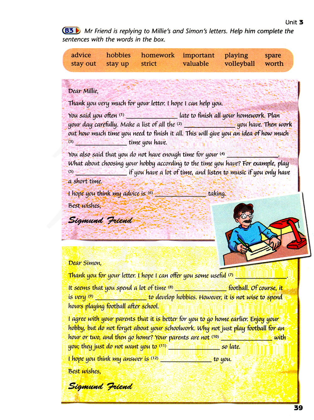 弗兰德先生在回复米莉和西蒙的信,用方框里的词帮助他完成句子。