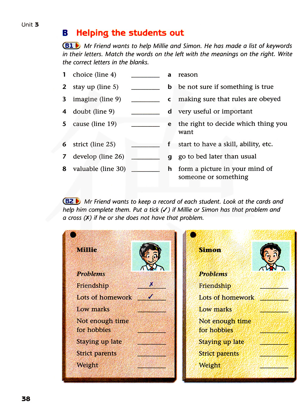 弗兰德先生想给每个学生做记录,看这些卡片并帮助他完成它们,如果米莉或西蒙有那样的问题就打钩,如果他或她没有那样的问题就打叉。