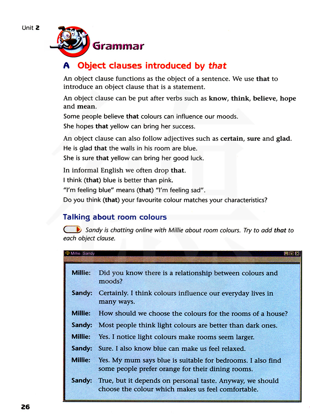 桑迪和米莉在线谈论房间的颜色,试着给每个宾语从句增加that。