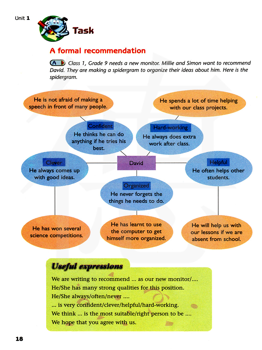 九年级一班需要一位新班长,米莉和西蒙想要推荐大卫,他们在做一张蜘蛛网图来组织他们对他的观点,这就是蜘蛛网图。