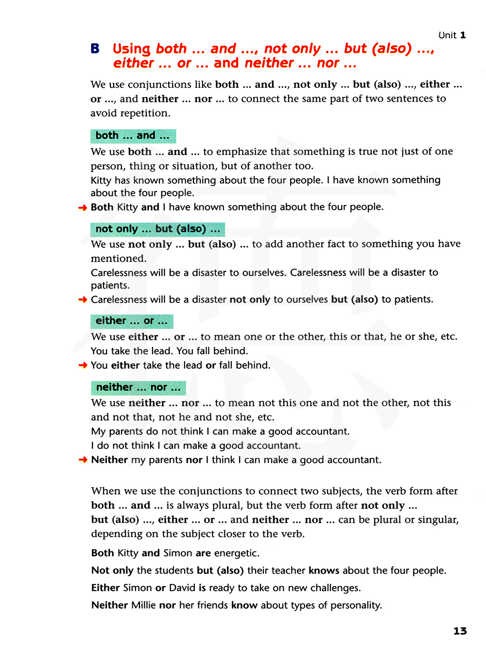 当我们用来连词连接两个主语时,both…and…后面的动词形式通常是复数,但是not only…but (also),either…or…和neither…nor…后面的动词形式可以是单数或复数,这取决于靠近谓语动词的主语。