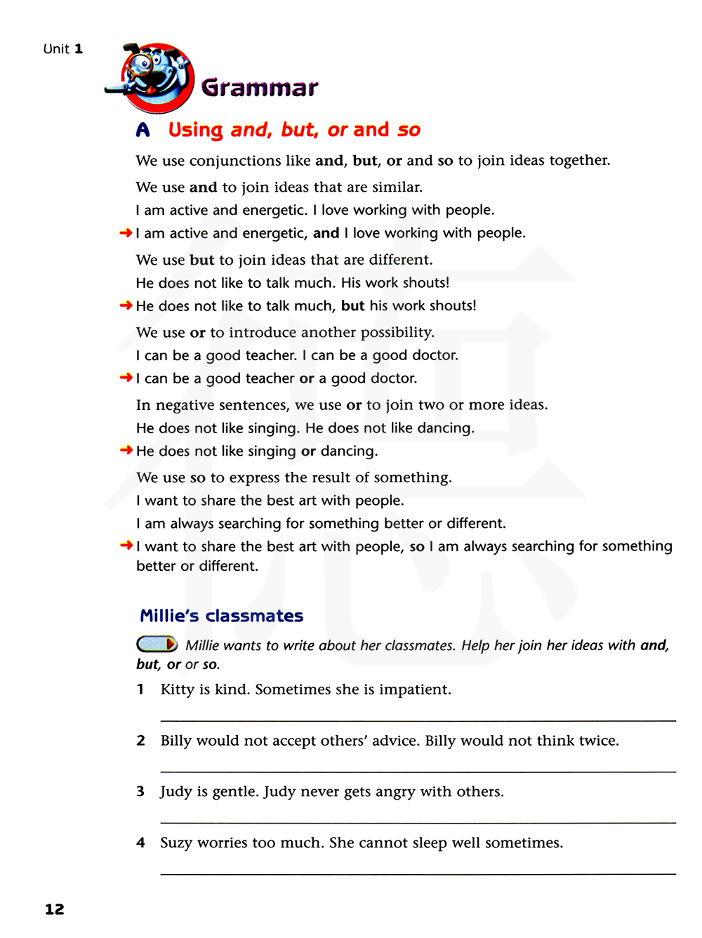 米莉想写一写她的同学们,帮助她使用and,but,or和so来连接她的想法。