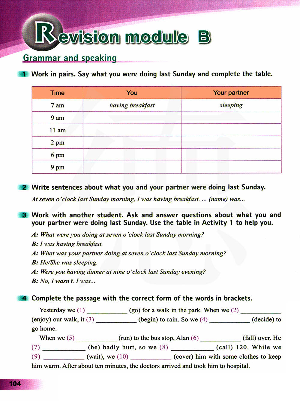 和另外一个同学一起练习,提问并回答上个星期天在做的事情,使用活动1 中的表格来帮助你