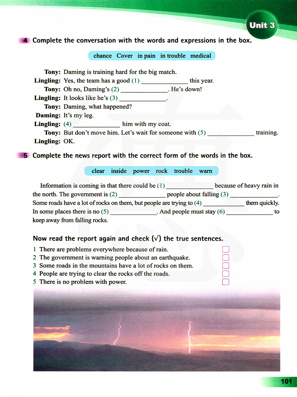 3.山区公路上有很多岩石 4.人们正在努力将岩石从道路上清除掉