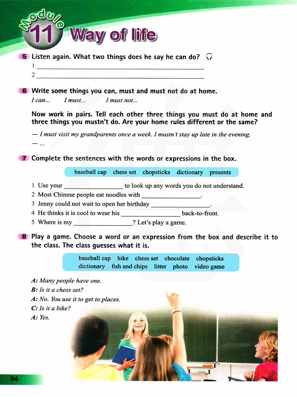 玩一个游戏,从方框里选一个单词或者短语并向全班描述出来,全班来猜一猜它是什么