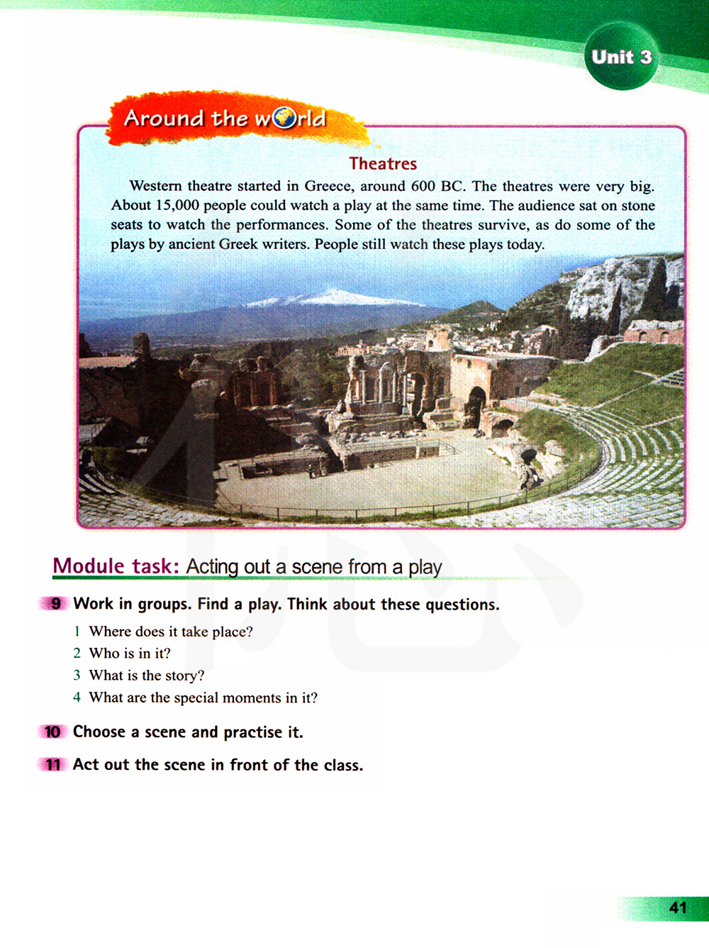 西方剧院大约于公元前 600 年在希腊开始(出现)。剧院很大,可以容纳大约 15000 名观众同时观看一部戏剧。观众们坐在石头座位上观看演出。其中一些剧院以及一些古希腊 作家写的戏剧都被保留了下来。今天人们仍然观看这些戏剧。