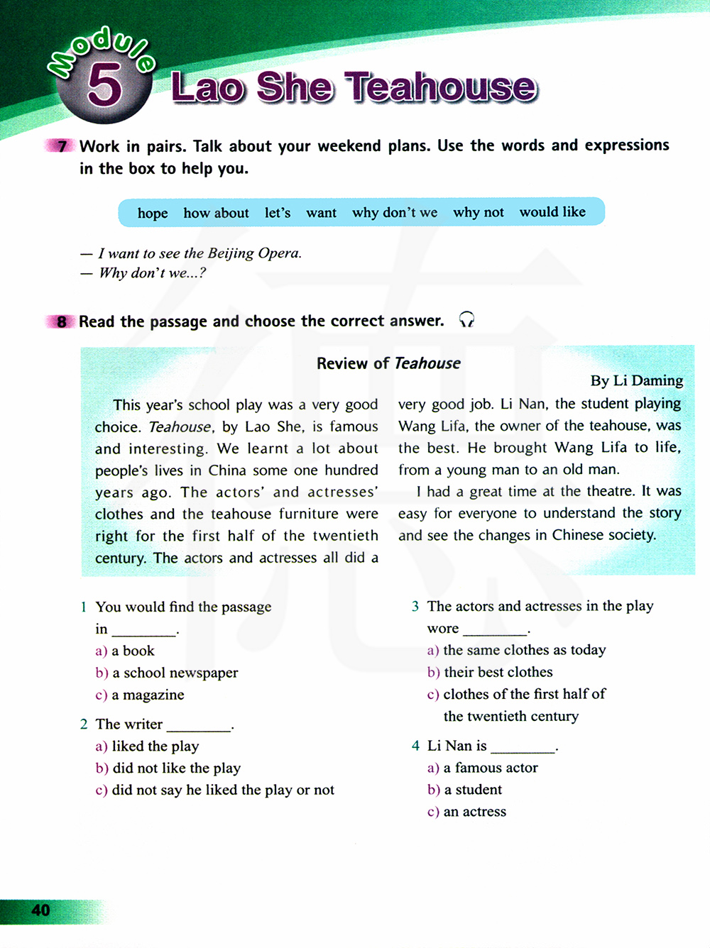 今年的校园剧是一个很好的选择,由老舍所作的茶馆很有名,也很有趣,我们了解到来很多有关中国人在大约100年前的生活情况,男女演员的服装和茶馆内的摆设很符合20世纪上半叶的情况