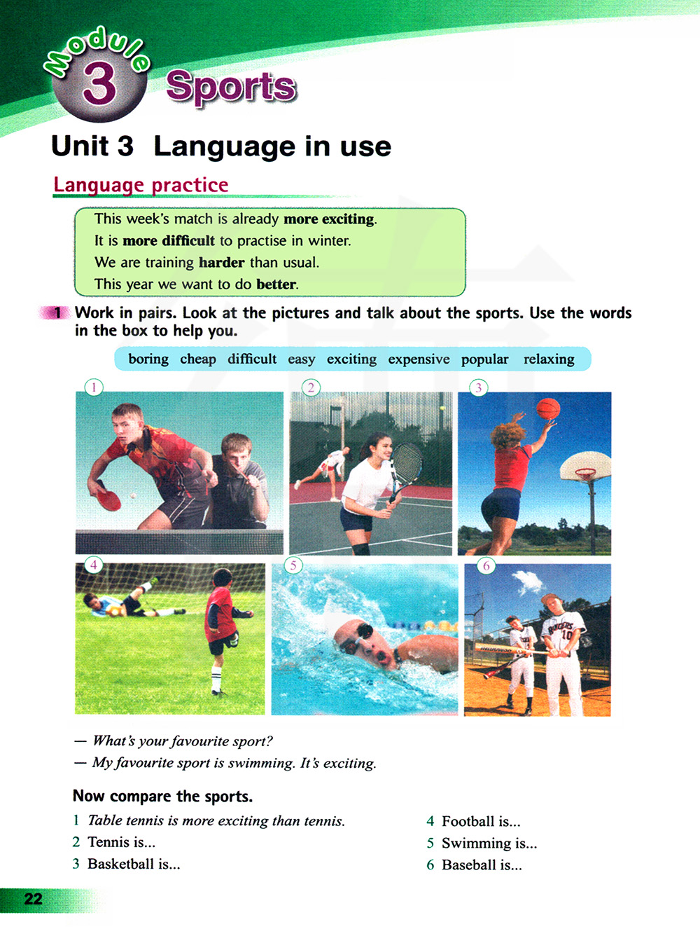 两人一组练习,看图片并谈论运动,使用方框里的单词来帮助你