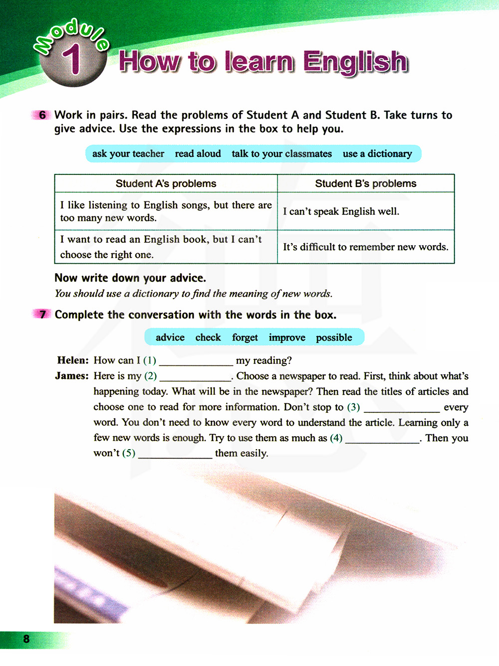 两人一组练习,如学生A和学生B这些问题,轮流回答给出建议,使用方框里的表达来帮助你