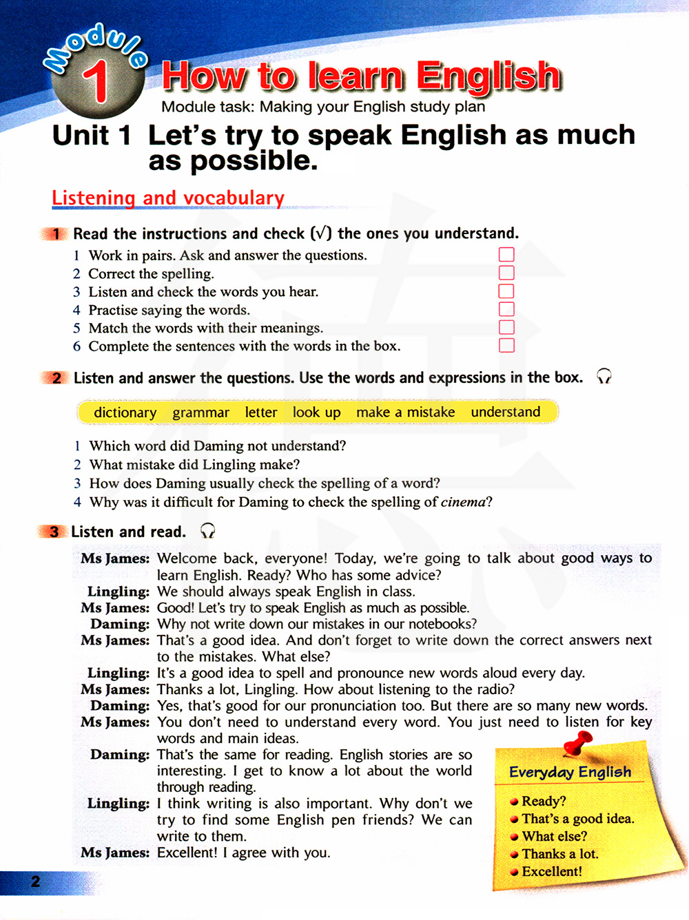 5.Let’s try to speak English as much as possible. 让我们一起尽可能地说英语。