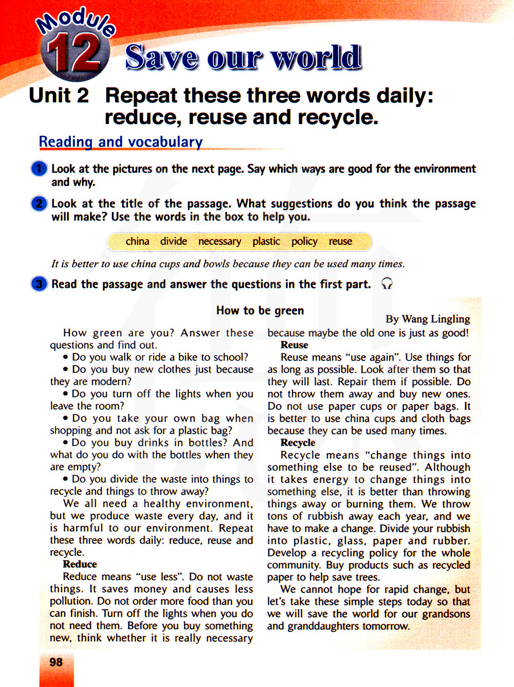 第二单元 每天重复这三个词:减少利用,在使用和回收利用。