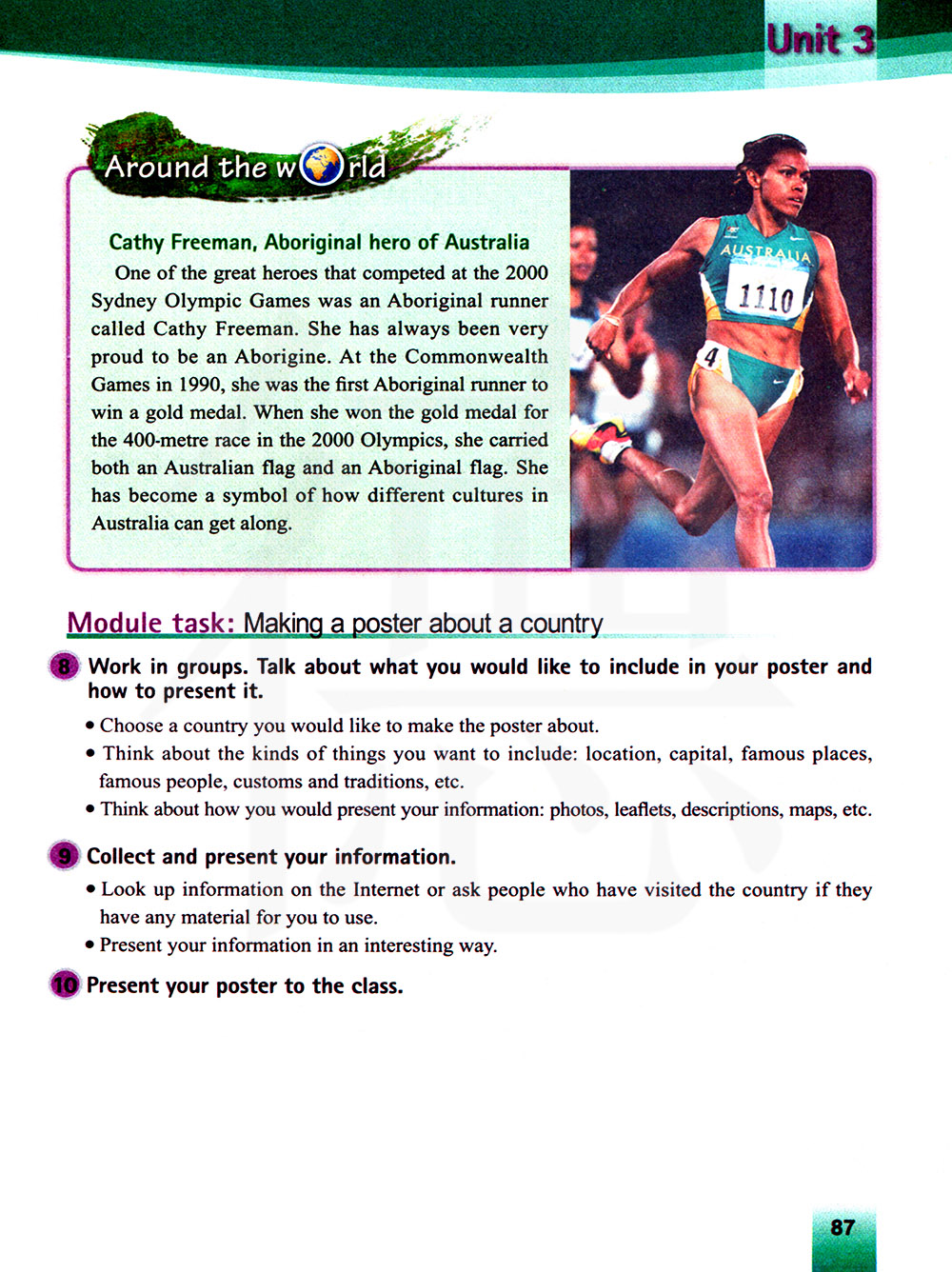 参加2000年悉尼奥运会的伟大的英雄之一就是一位叫做凯西.费里曼的土著跑步运动员。他一直是以自己是一位土著居民而自豪。在1990年的英邦运动会上,他是第一位赢得金牌的土著跑步运动员。在2000年的奥运会上,他赢得了400米赛跑的金牌。他拿着澳大利亚的国旗和土著国旗。他已经成为了澳大利亚不同文化相处融洽的象征。