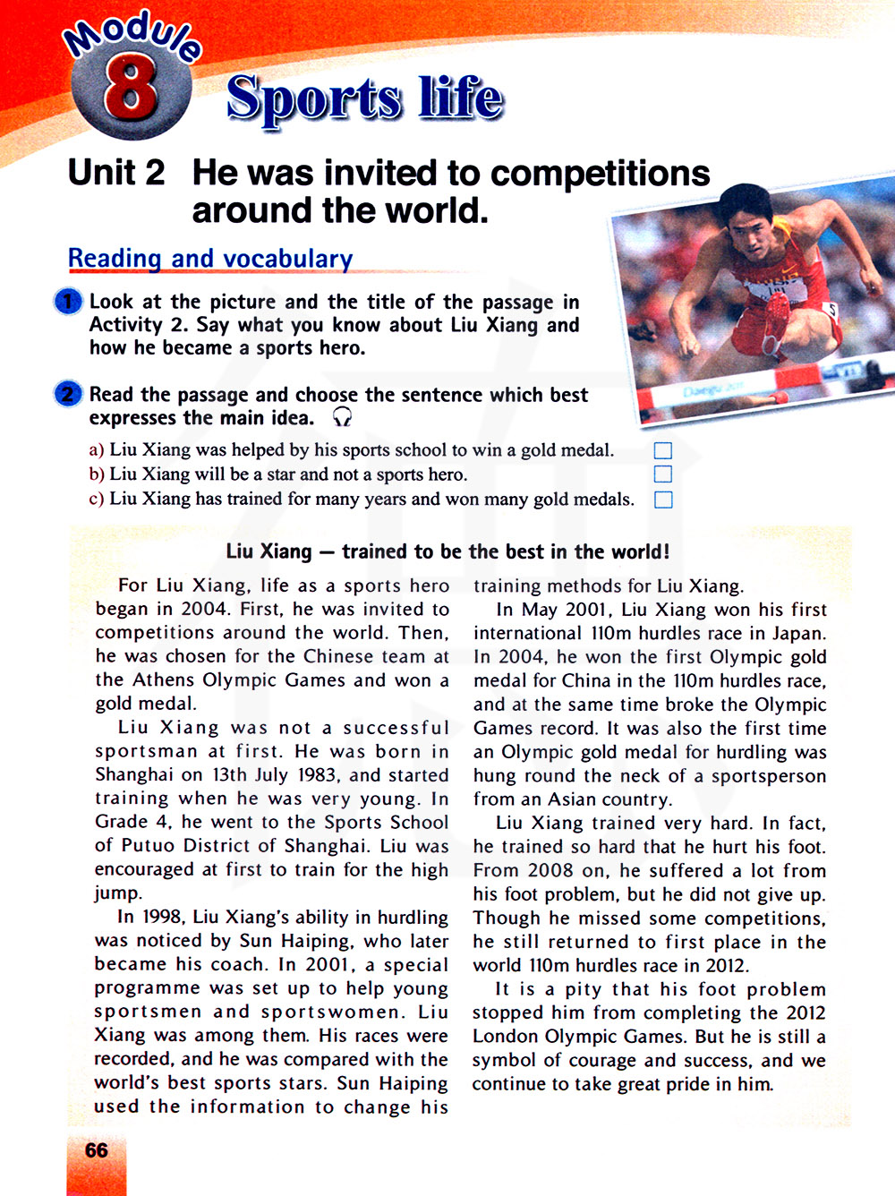 看图片和活动2中文章的标题。描述一下你都了解刘翔的那些方面,他是怎样成为一位体育英雄的。