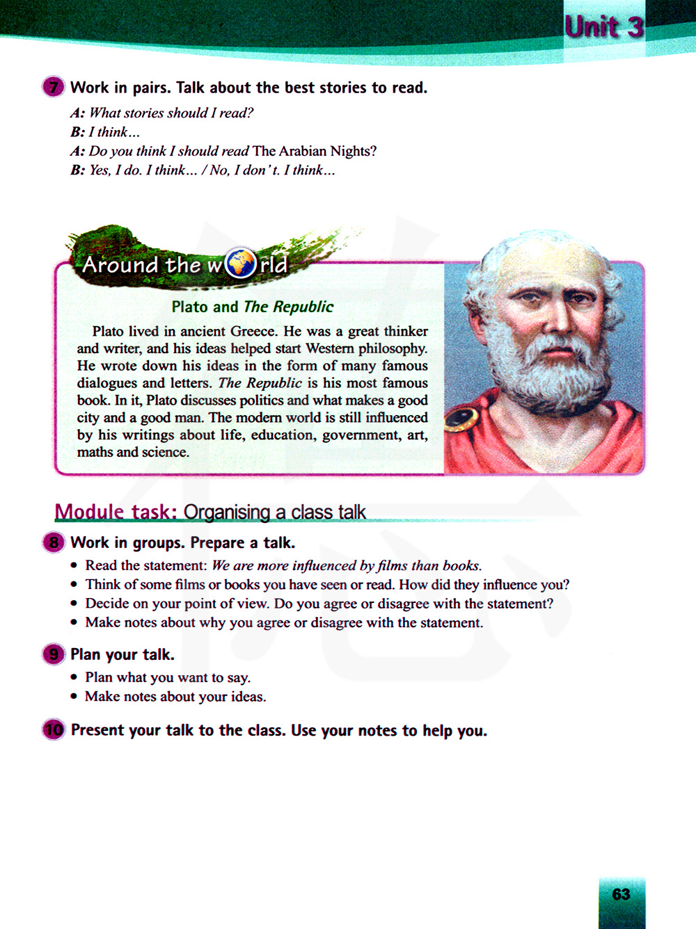 柏拉图生活在古希腊。它是一位伟大的思想家兼作家。她的理念有助于西方哲学的开创。她把她的思想以及她的很多对话和写信的格式都写了下来。《理想国》是他最有名的一本书。在《理想国》这本书里,柏拉图谈了政治以及怎么样才能建造一个好城市和培育一个好人。现代世界仍然深受他的生活和,教育,振幅,艺术,数学和科学等方面著作的影响。