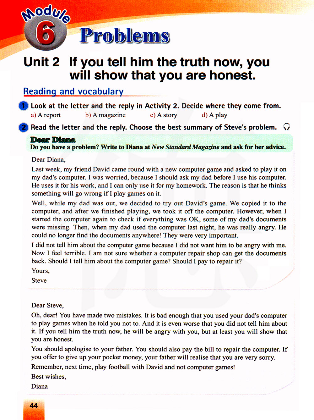 你应该向你爸爸道歉。你也要支付修电脑的钱。如果你愿意拿出你自己的零花钱,你爸爸就会意识到你的歉意。记住,下次和大卫去踢足球,不要去玩电脑游戏了!美好的祝愿 戴安娜