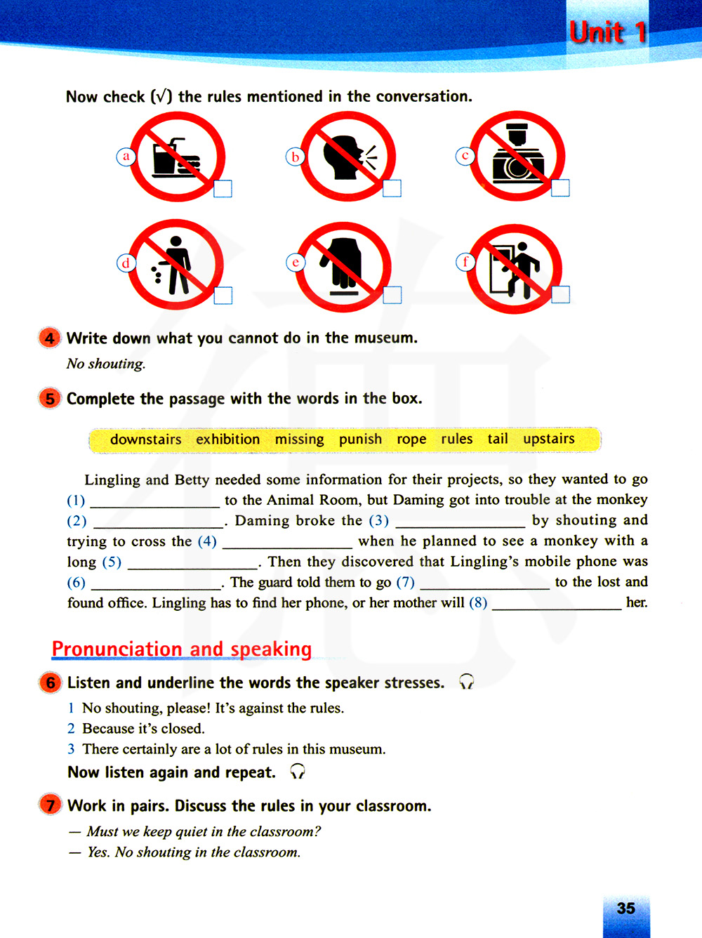 写下你在博物馆不可以做的事情。不准喧哗