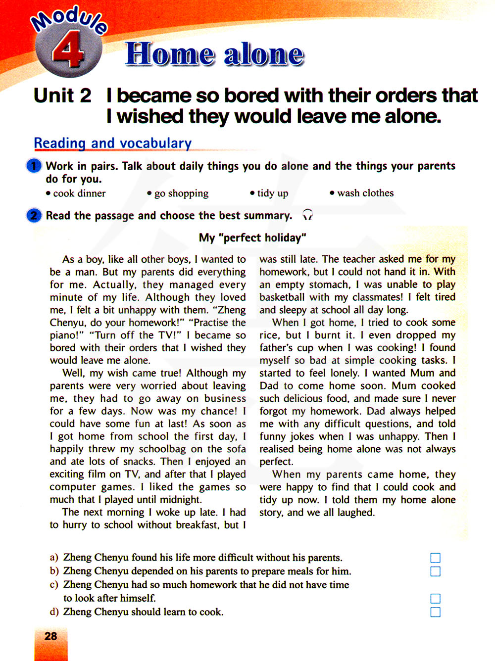 当我回家的时候,我想试着煮点饭,但是烧焦了。在我做饭的时候。我甚至把爸爸的杯子摔了!我发现自己在做饭这件这么简单的事情上表现得如此糟糕。我开始感到孤独。我希望爸爸妈妈快点回来。妈妈煮的饭菜是如此美味,妈妈永远都会提醒我要做作业。在遇到难题的时候,爸爸总会帮助我。当我不开心的时候,总会给我讲有趣的笑话逗我。然后我意识到自己独自在家并不总是完美的。