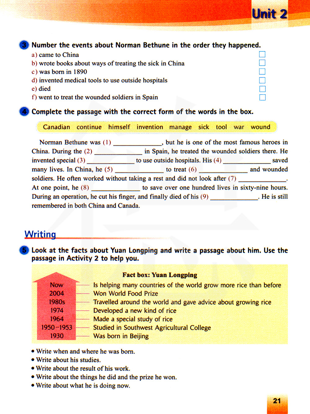 看一看有关袁隆平的实况,然后写一篇关于他的文章。用活动2中的文章帮助你。