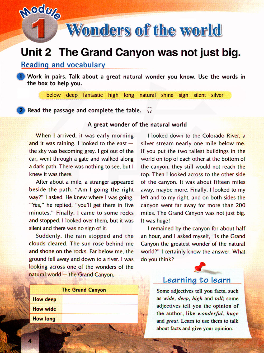 一些形容词可以告诉你实际情况。例如宽的,深的,高的;一些形容词可以告诉你作者的观点,想奇妙的,巨大的和伟大的。学着用这些形容词谈论实际情况以及给出你的观点。