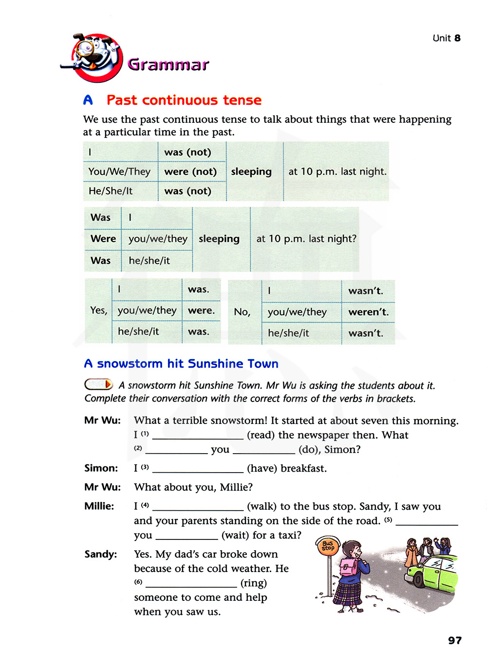 一场暴风雪袭击阳光镇。吴先生正在询问学生有关它的情况。用括号中动词的正确形式完成他们的对话。