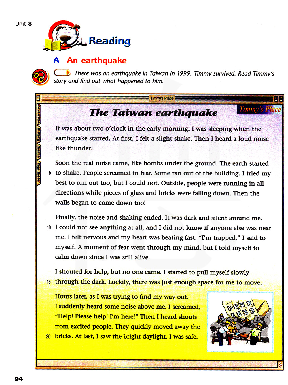 1999年台湾发生了一场地震。蒂米幸存下来了。阅读蒂米的故事,找出他发生了什么。