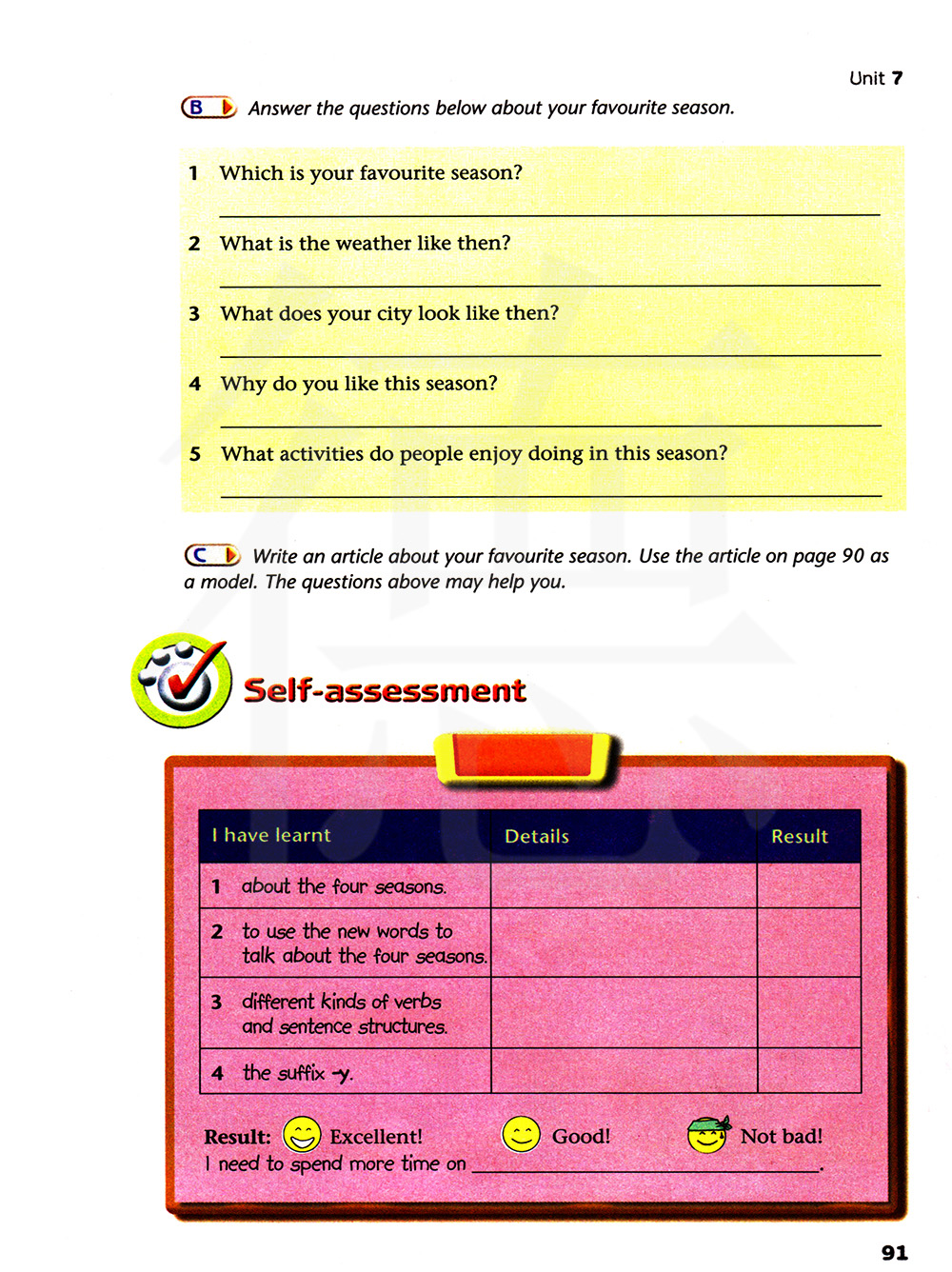 写一篇关于你最喜欢的季节的文章。以第90页的文章为例。上面的问题可能会帮到你。