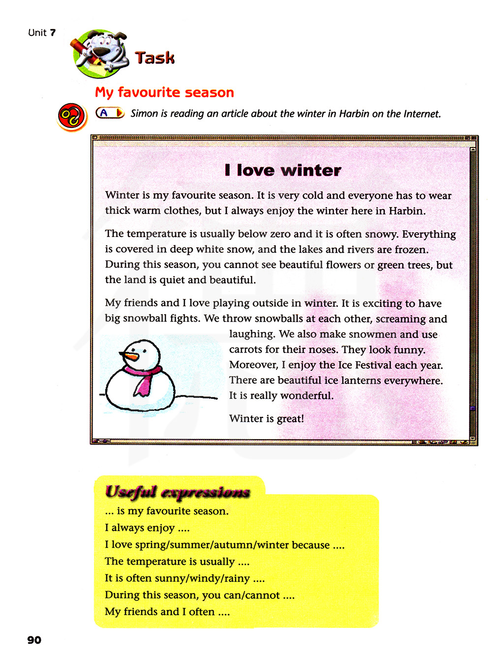 冬天我和朋友喜欢在外面玩耍。打一场大的雪仗是令人兴奋的。我们向对方扔雪球,叫着,笑着。我们还堆雪人,用胡萝卜充当鼻子。它们看起来很有趣。然而,我喜欢每年的冰雪节。到处都有漂亮的冰灯。真美妙。