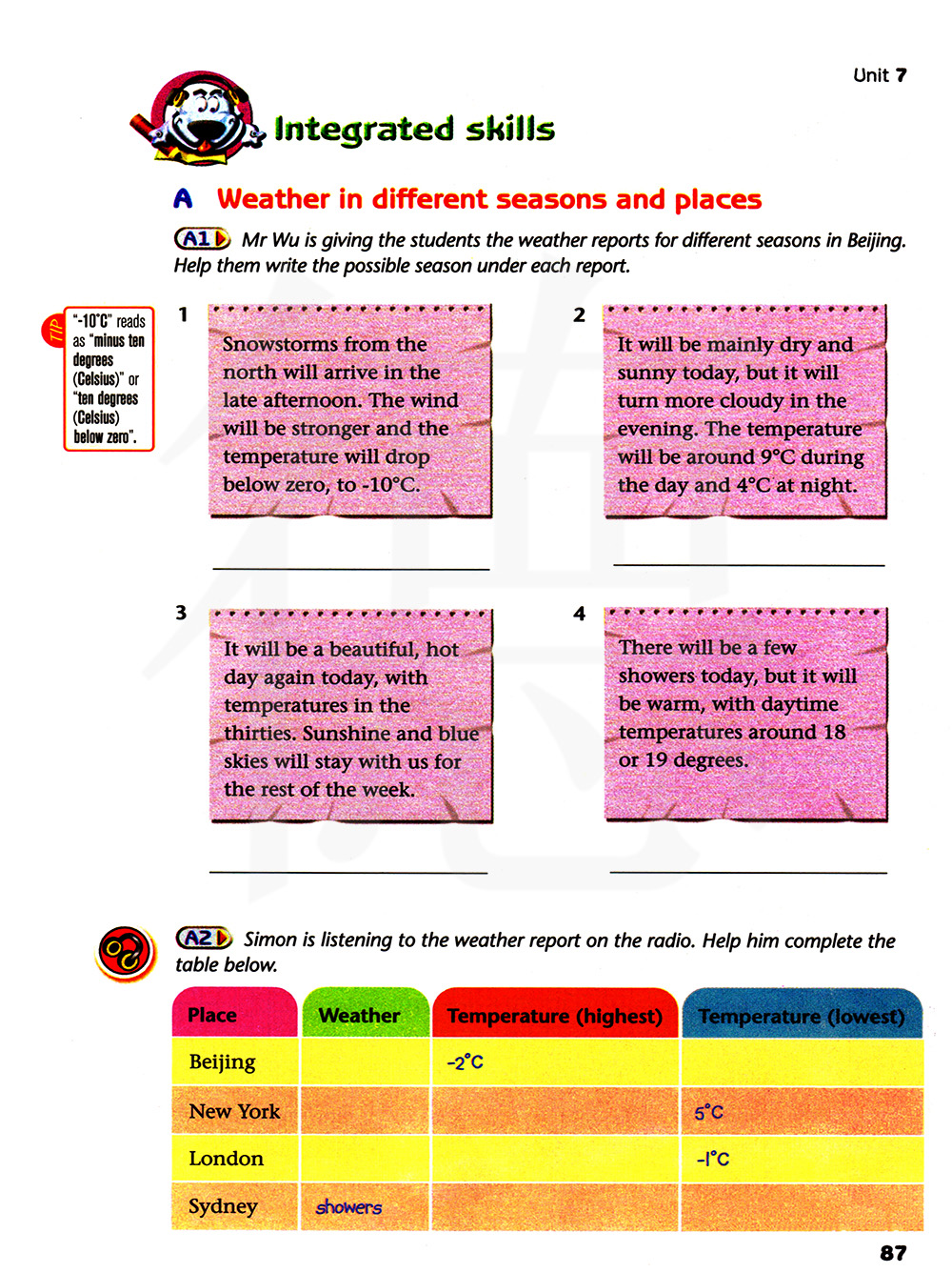 吴先生在给学生做天气预报,针对北京的而不同季节。帮助他们在报告下面写出可能的季节。