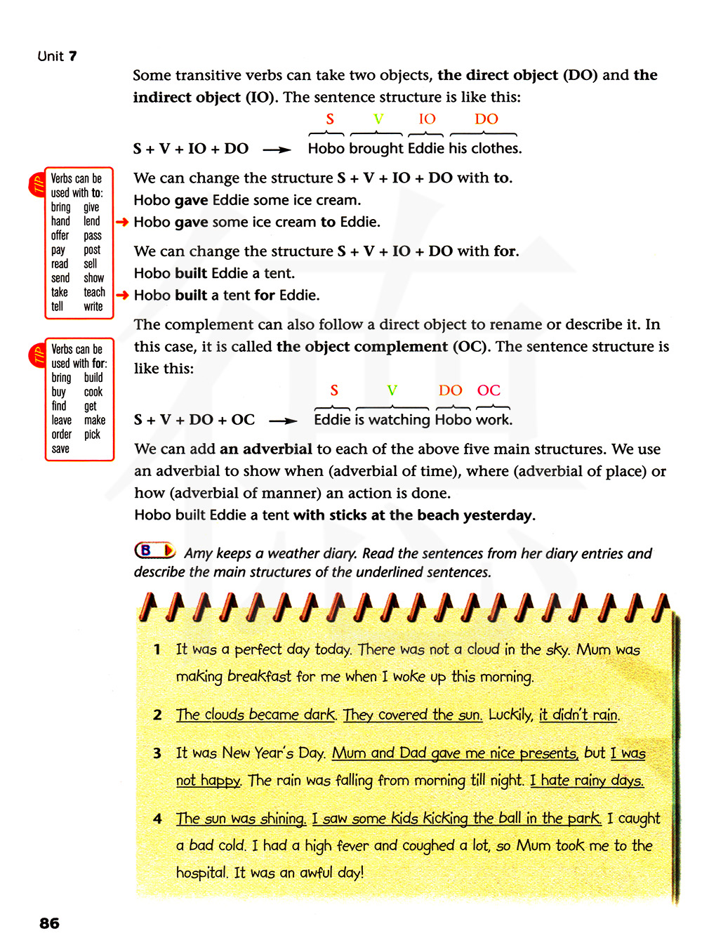 有些及物动词可以带两个宾语,直接宾语和间接宾语。句子结构为这样:主语加动词加直接宾语加间接宾语,霍波给埃迪带来了衣服。