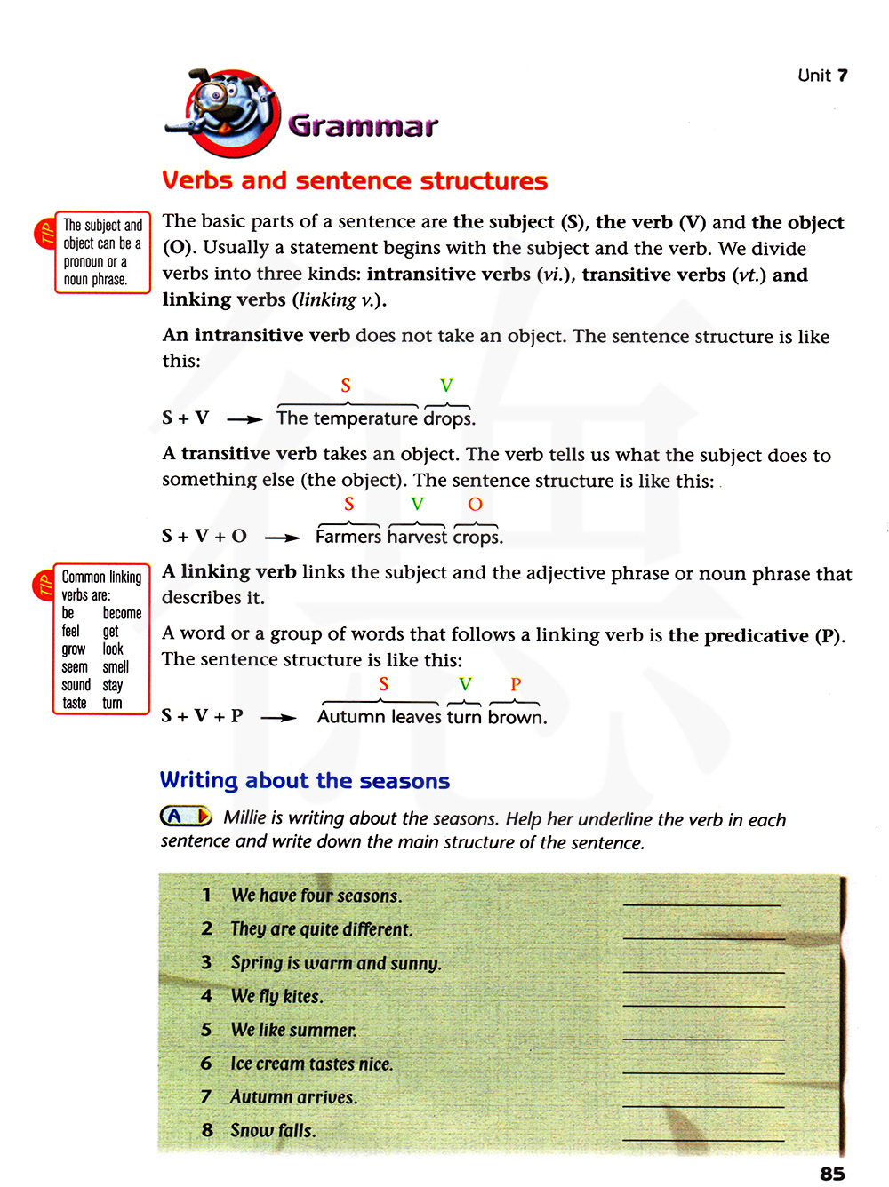 米莉在写季节。帮助她划出每个句子的动词并写下句子的主要结构。