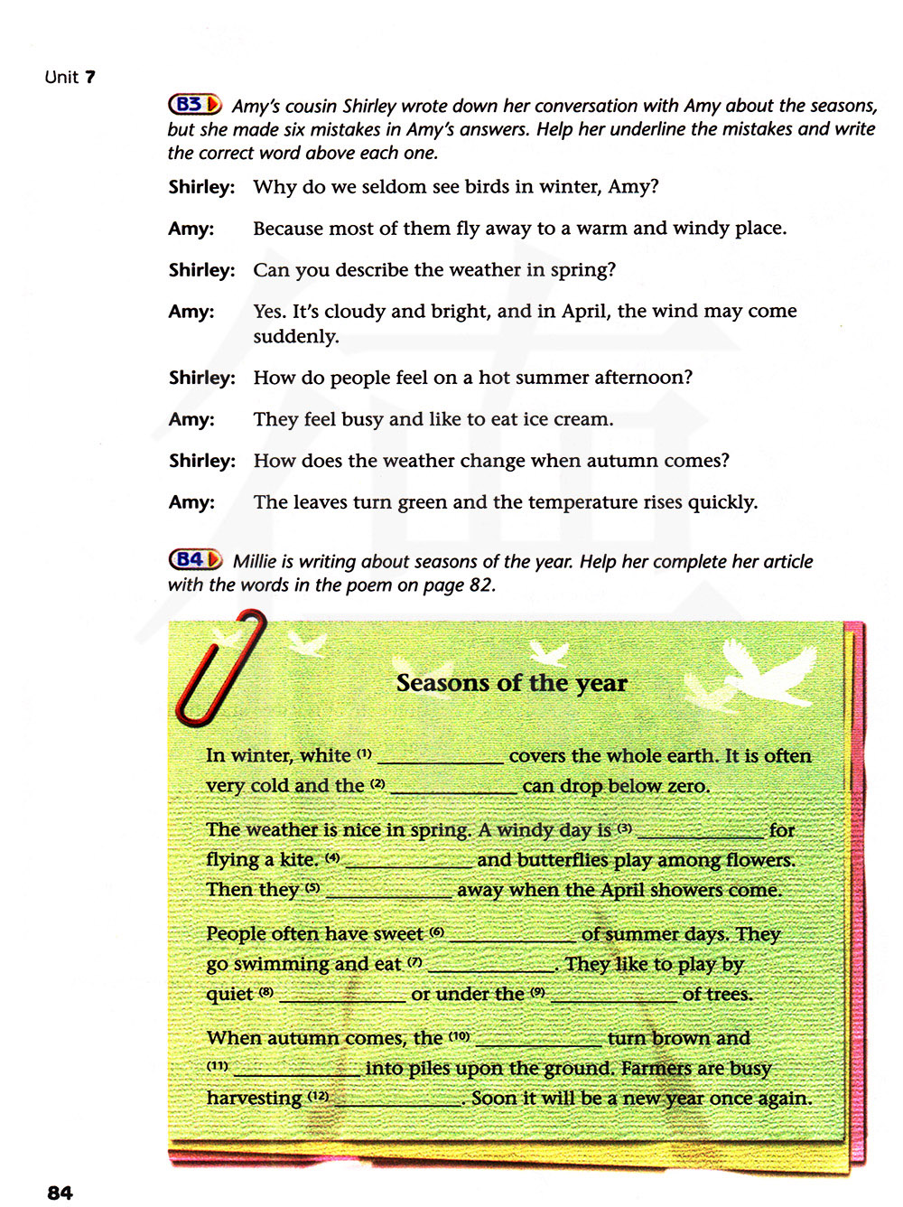 艾米的表妹写下了与艾米关于季节的对话,但她在艾米的回答中犯了六个错误。帮助她划出错误并在上面写上正确的单词。