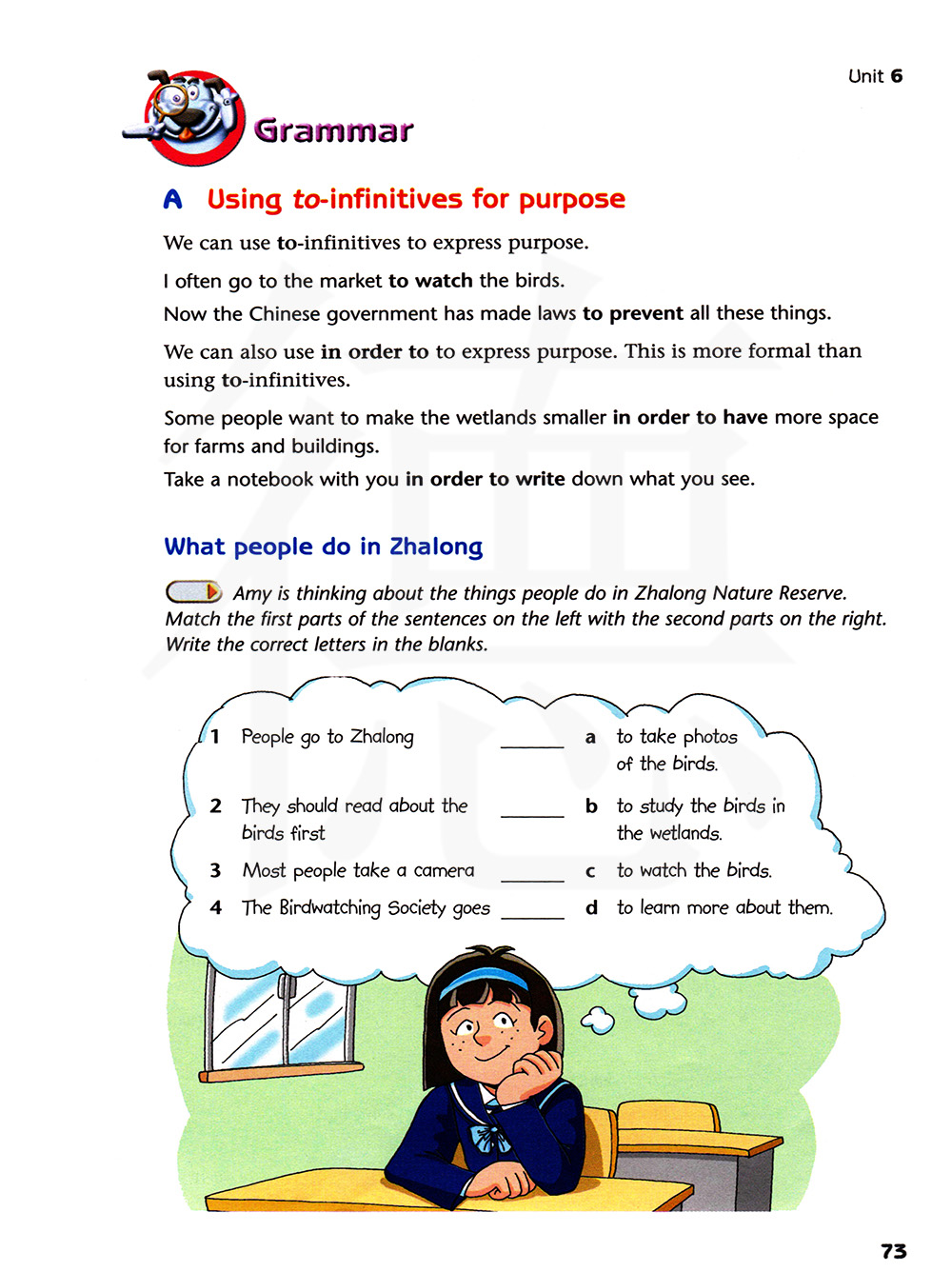 艾米正在想人们在扎龙自然保护区所做的事情。把句子在左边的第一部分与右边的第二部分进行搭配。在空白处写上正确的字母。