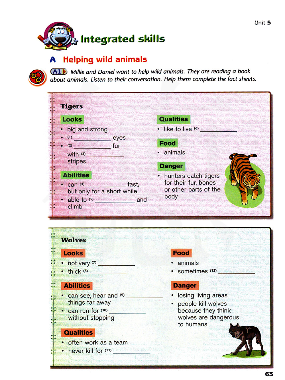 米莉和丹尼尔想帮助野生动物。他们正在阅读一本关于动物的书。听他们的对话。帮助他们完成情况说明。