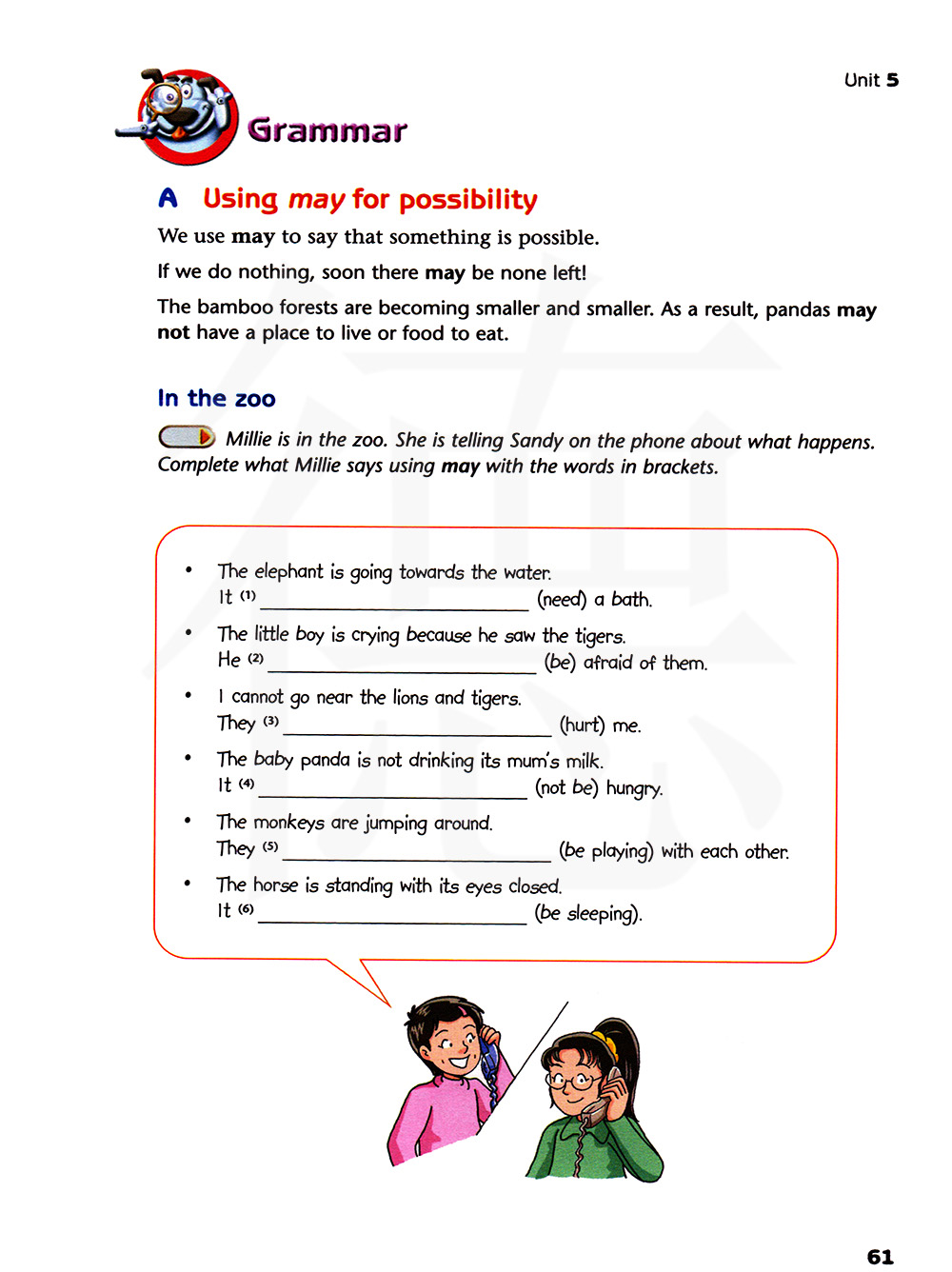 米莉正在动物园。她正在电话里告诉珊迪发生了什么。用“may”和括号中的单词完成她所说的。