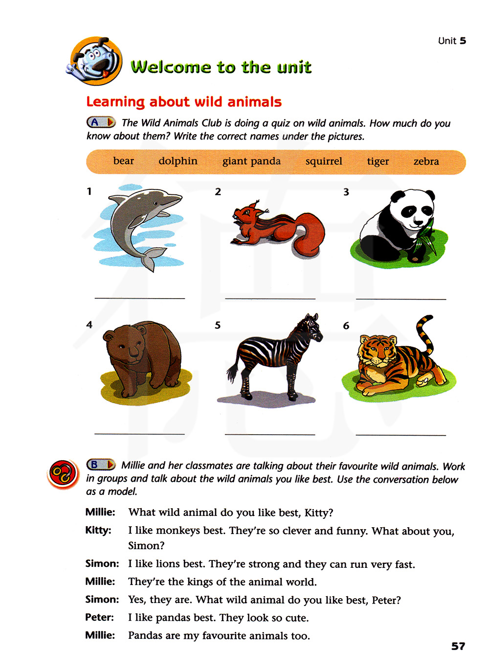 米莉和她的同学们正谈论她们最喜欢的野生动物。分组活动并谈论你们最喜欢的野生动物。下面的对话可以作为参考。